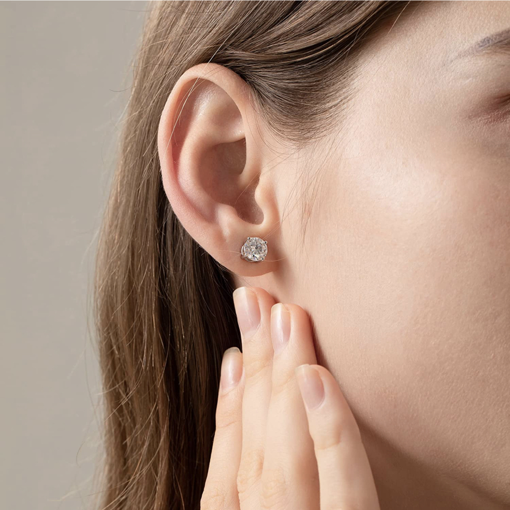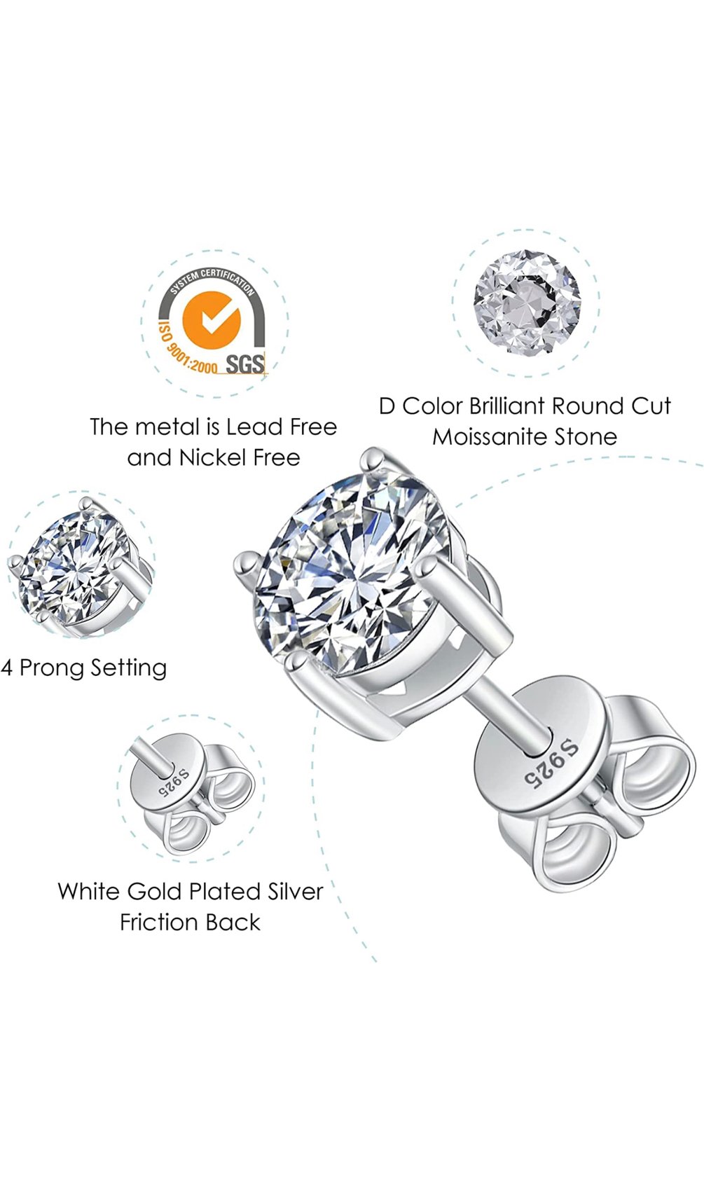 -MATERIALS: This moissanite stud earrings is made with 18K white gold plated silver and created moissanite. The back finding is post with friction back. Made to last a lifetime, strong and durable! All the metals we use are lead free, nickel free and hypoallergenic.
